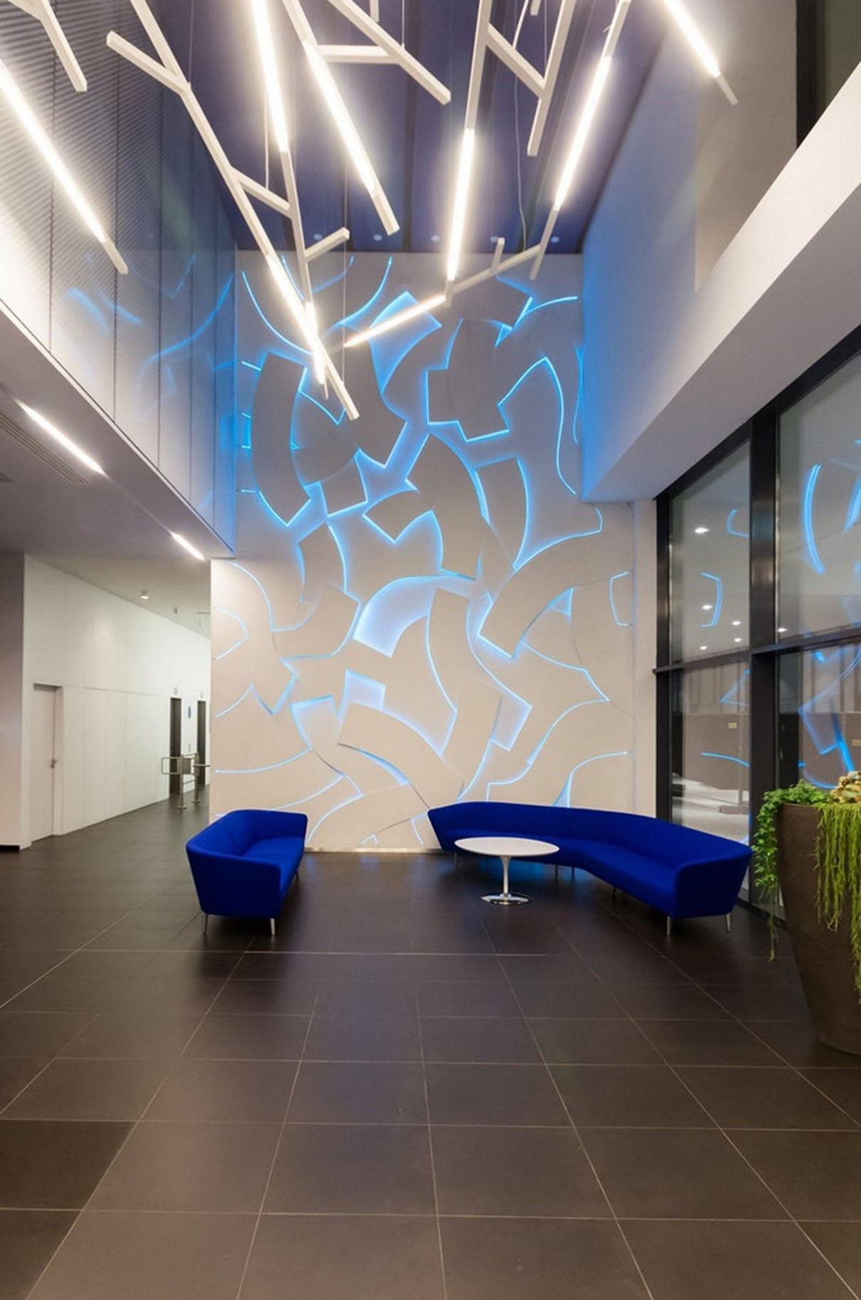 In addition to the shapes, the tension of the space is further enhanced by RGB LED light sources that illuminate the shapes from behind and can be programmed as desired. Indirect light is reflected from the surface of the wall behind the shapes and the reflections of light and colour on the shapes create a positive sense of life and atmosphere in the space.